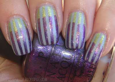 I'm on a stripes kick, what can I say? Today's lazy weekend post consists of 4 polishes. China Glaze Pelican Gray for my base color, OPI Simply Smashing!, OPI Grape... Set... Match, and China Glaze C-C-Courage for my gradient stripes. Those names... lol...