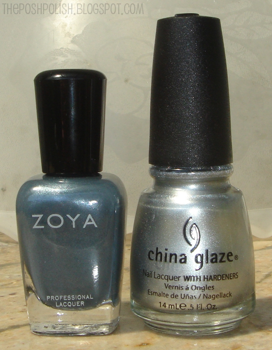 Onto today's mani... what I have for you is another scotch tape mani using two colors. My base polish was Zoya Marina from the current Fall 2011 Smoke and Mirrors Collection and China Glaze Millennium from the Fall 2009 Khrome Collection. Marina is a beautiful dark blue gray with silver microshimmer. The base polish actually has a slight streaky look to it that may show very minimal brush strokes but nothing that is bad in my opinion. Millennium is a popular silver mirror/chrome/foil color that has been around for quite some time. It dried extremely quickly! Please don't mind the outgrowth in my nails. I had this mani on for almost 5 days! Yes - I was that busy, no joke.